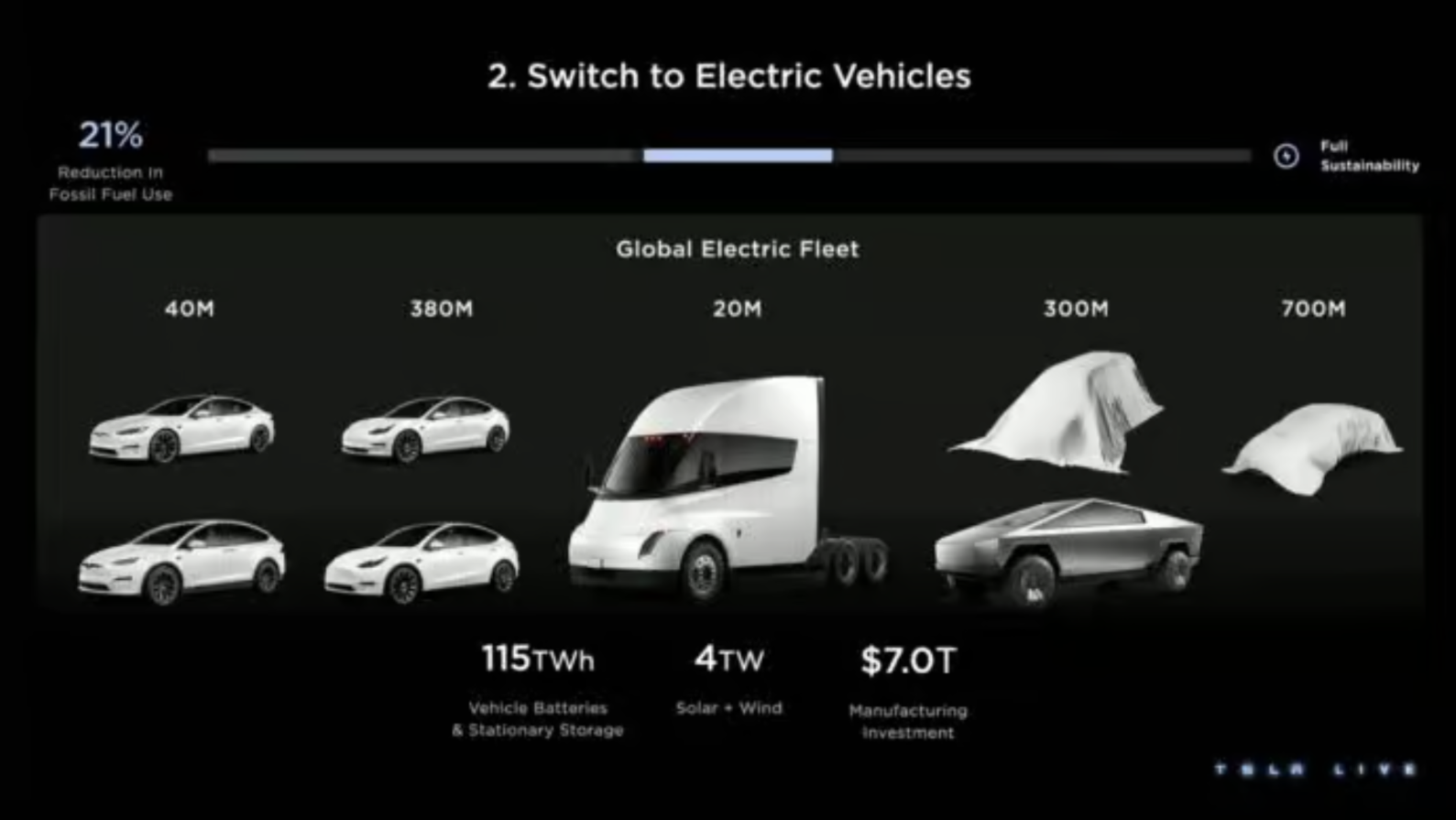 特斯拉於 2023 年發布的「Master Plan Part 3」,確立全球經濟邁向 100% 永續能源的路徑。這個計畫用電氣化和綠能當主要能源,從宏觀經濟角度證明了淘汰化石燃料的低成本優勢與可行性。